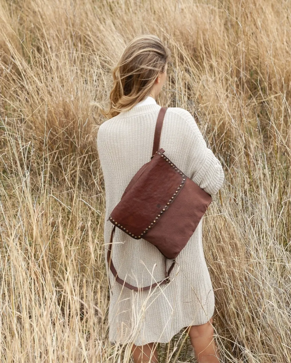 Vintage-Effect Cotton Backpack Bag With Natural Leather Details And Embellishment With Different Types Of Studs On The Flap. Zip Pocket On The Back. Cotton Lining. Multiple Pockets Inside. Zip And Flap Closure. Coleccion:Whitney