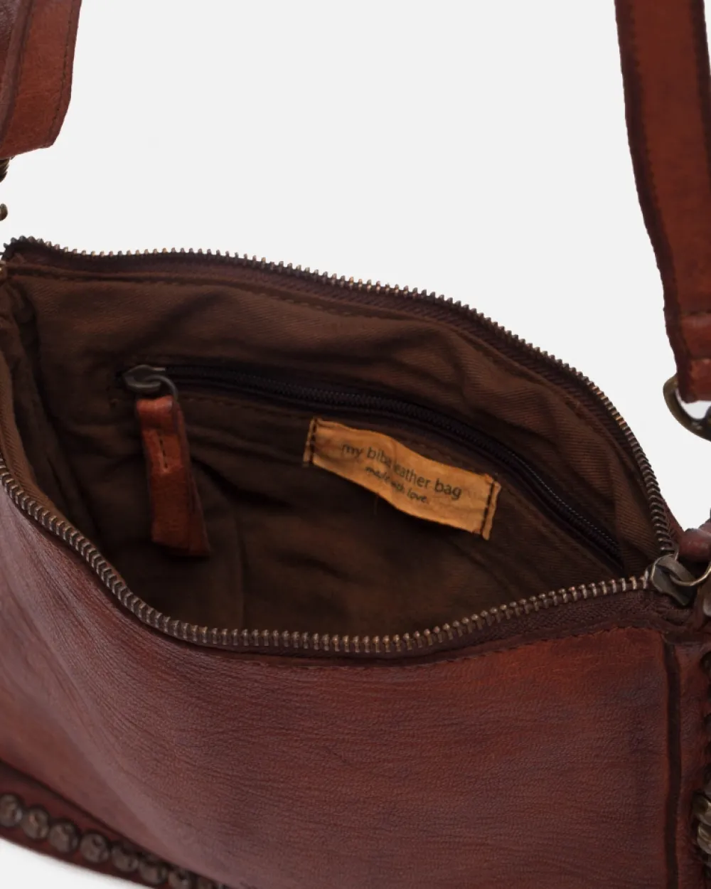 Washed, And Vegetable Tanned Sheep Leather Cross Bag. Studs On The Edges Of The Bag. Zip Closure, Adjustable And Removable Shoulder Strap, Internal And External Pockets, And Cotton Lining. Coleccion:Portland