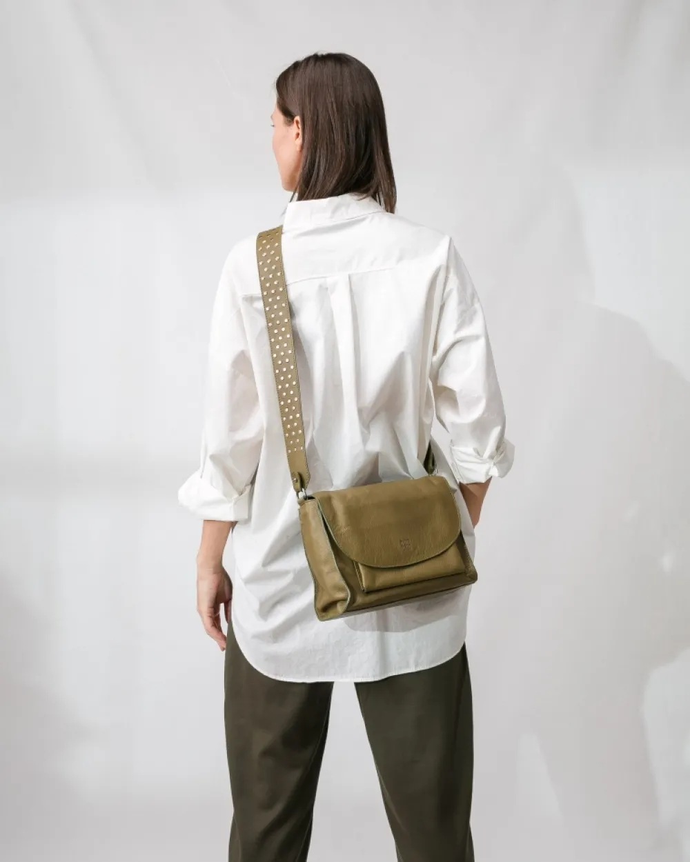 Natural Bovine Leather Bag With Studs On The Removable Shoulder Strap. Pocket On The Front. Cotton Twill Lining. Multiple Pockets Inside. Automatic Flap Closure. Coleccion:Easley
