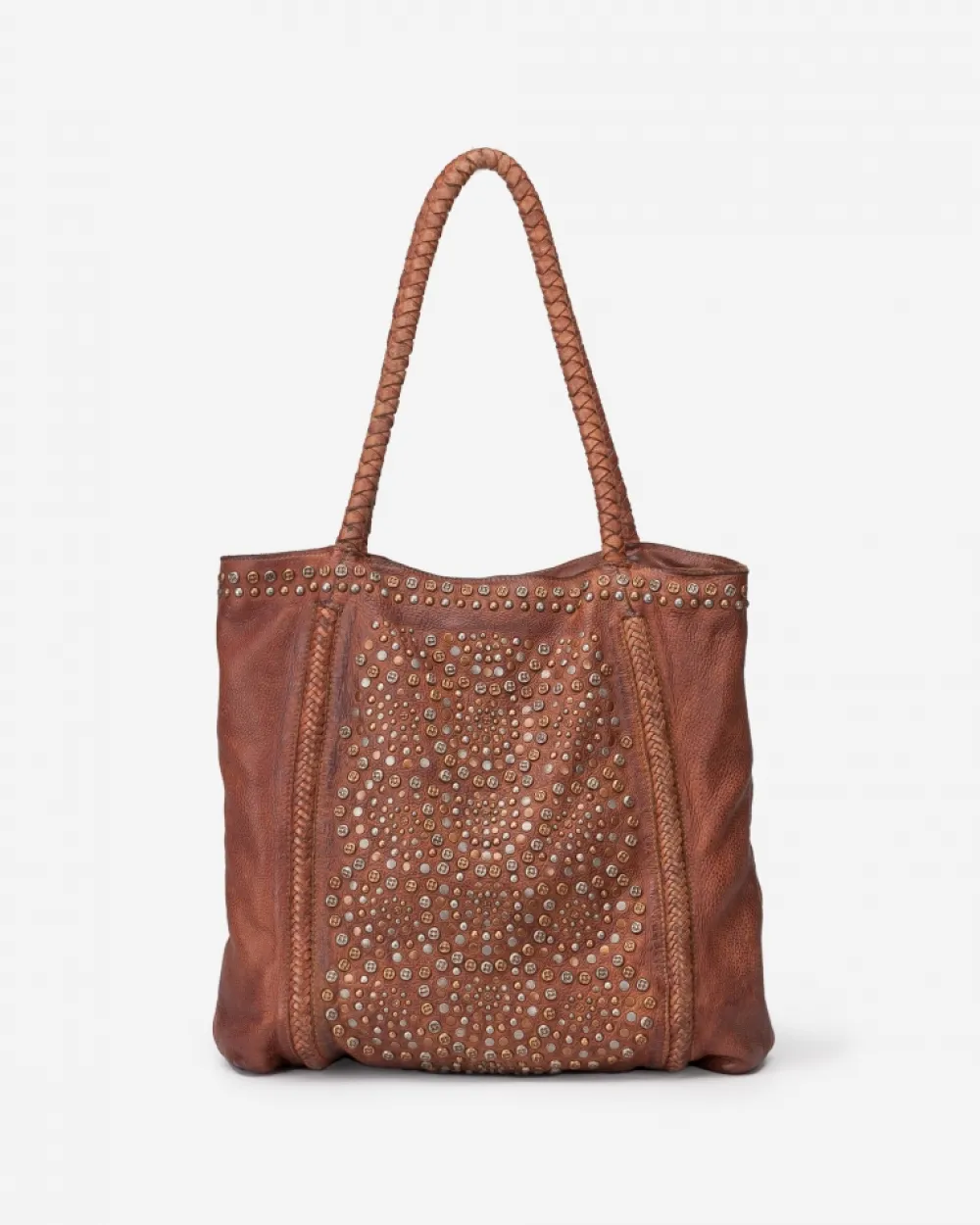 Washed And Vegetable-Tanned Bovine Leather Shopper. Complex Technique Of Hand Braiding And Application Of Studs. Zip Closure, External And Internal Pockets, And Cotton Lining. Material:Bovine Leather