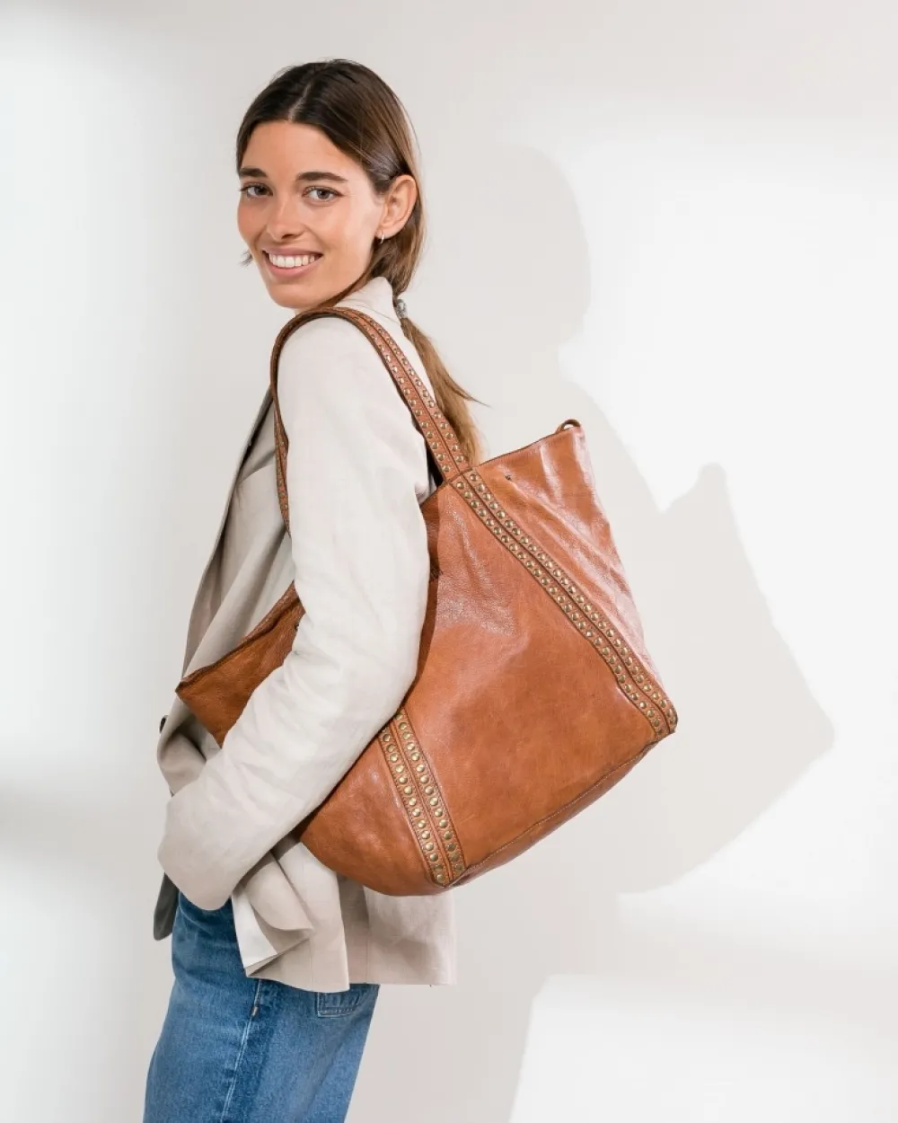 Shopper Bag In Natural And Vegetable Tanned Leather. Gold Studs Embellishments. Snap Button And Magnet Closure, And Hook And Loop On The Sides To Modify The Shape Of The Bag. Zippered Pocket On Top For Easy Access. Coleccion:Sherman